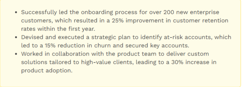 Consider rewriting it as: “Developed and implemented a strategy to identify at-risk accounts, achieving a 15% reduction in customer churn and securing key accounts.”