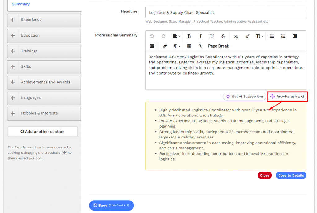 Upload your LinkedIn profile or an existing resume. Take advantage of the AI features to optimize every section of your resume, creating a more personalized and impactful presentation: