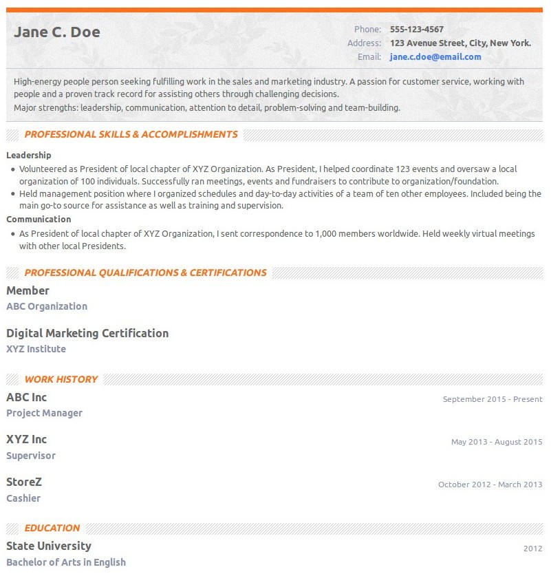 The hybrid format combines the reverse chronological and functional formats. This format benefits applicants with a lot of job history and wants to highlight their experience and expertise. When formatting your combination resume, it’s important to have a section that summarizes your qualifications and professional profile.